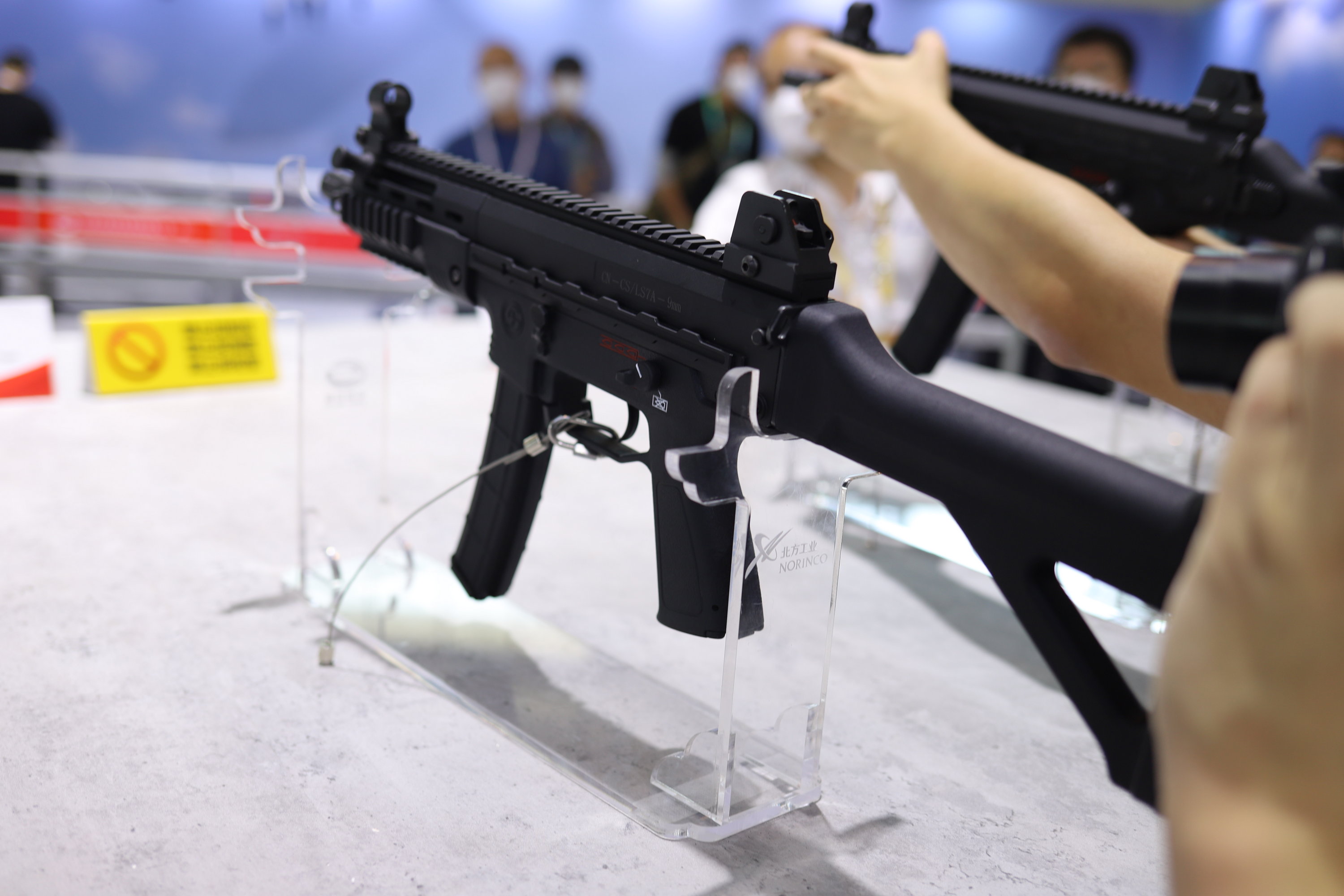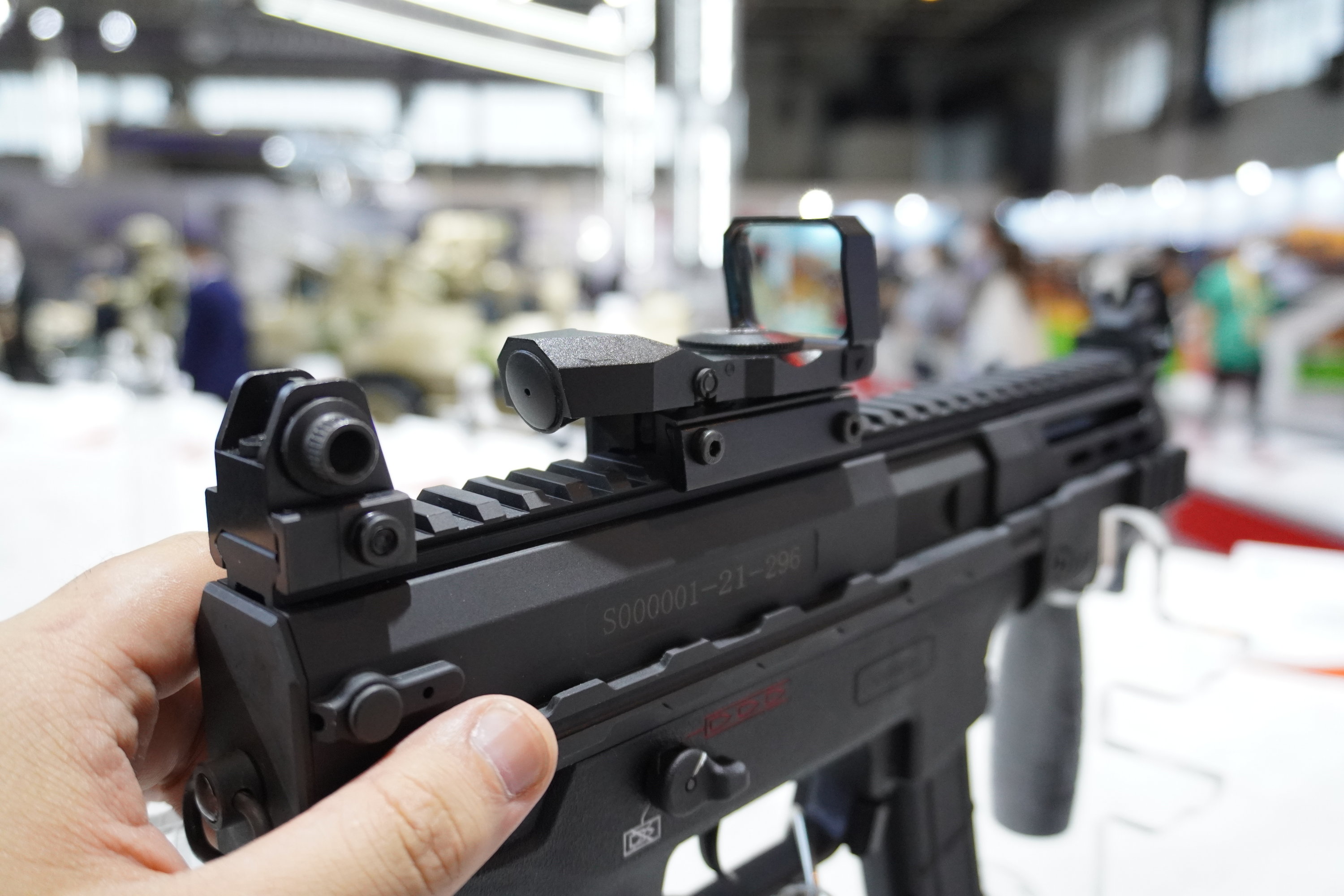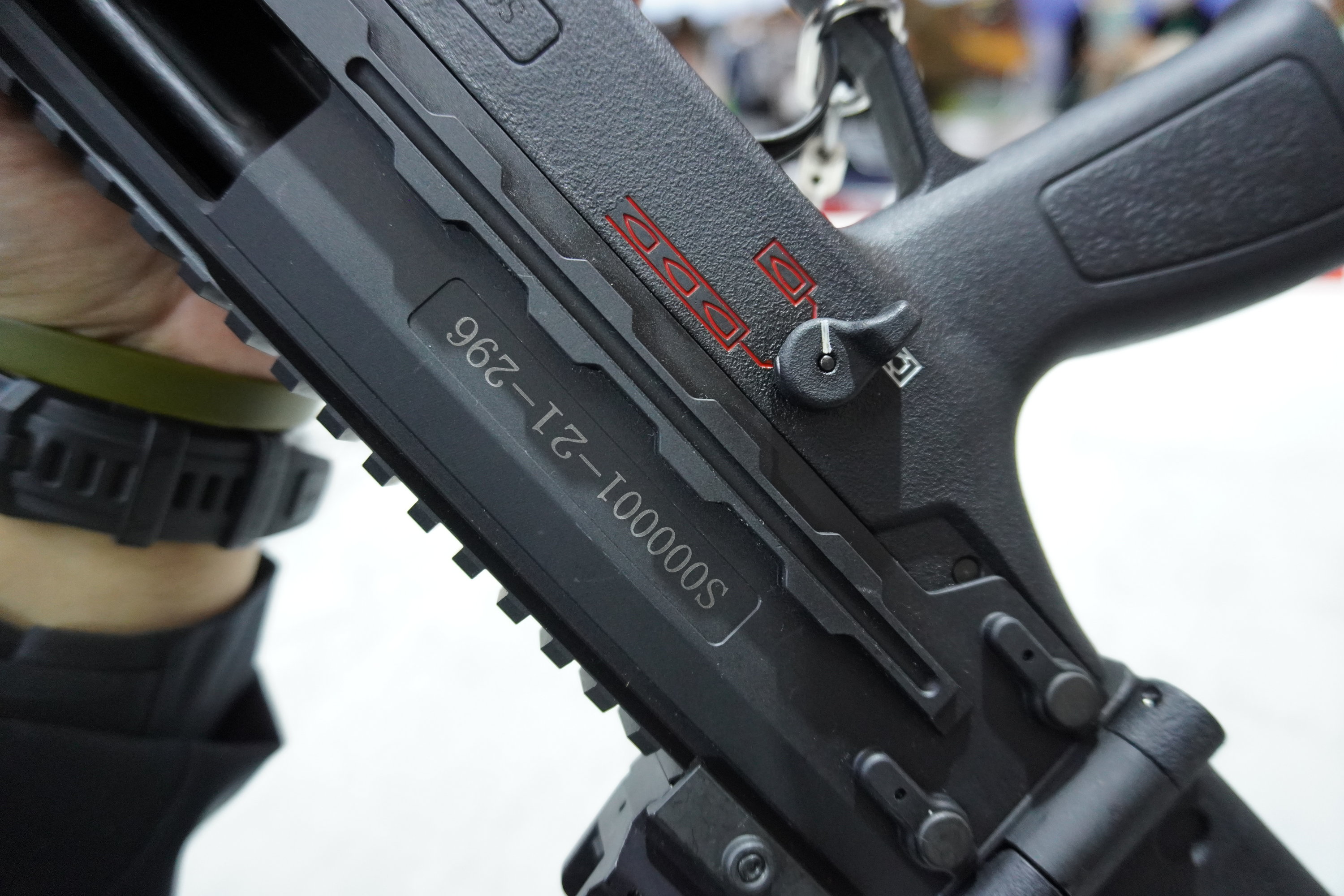 下机匣左侧有空仓挂机释放钮。机械瞄具是固定的,准星有护圈保护。枪托有两种类型,一种是伸缩式,其固定卡扣的设计是类似于MP5的绕轴转动的大拨片;另一种是折叠式的塑料枪托,从图片判断托底板似乎可以伸出。