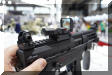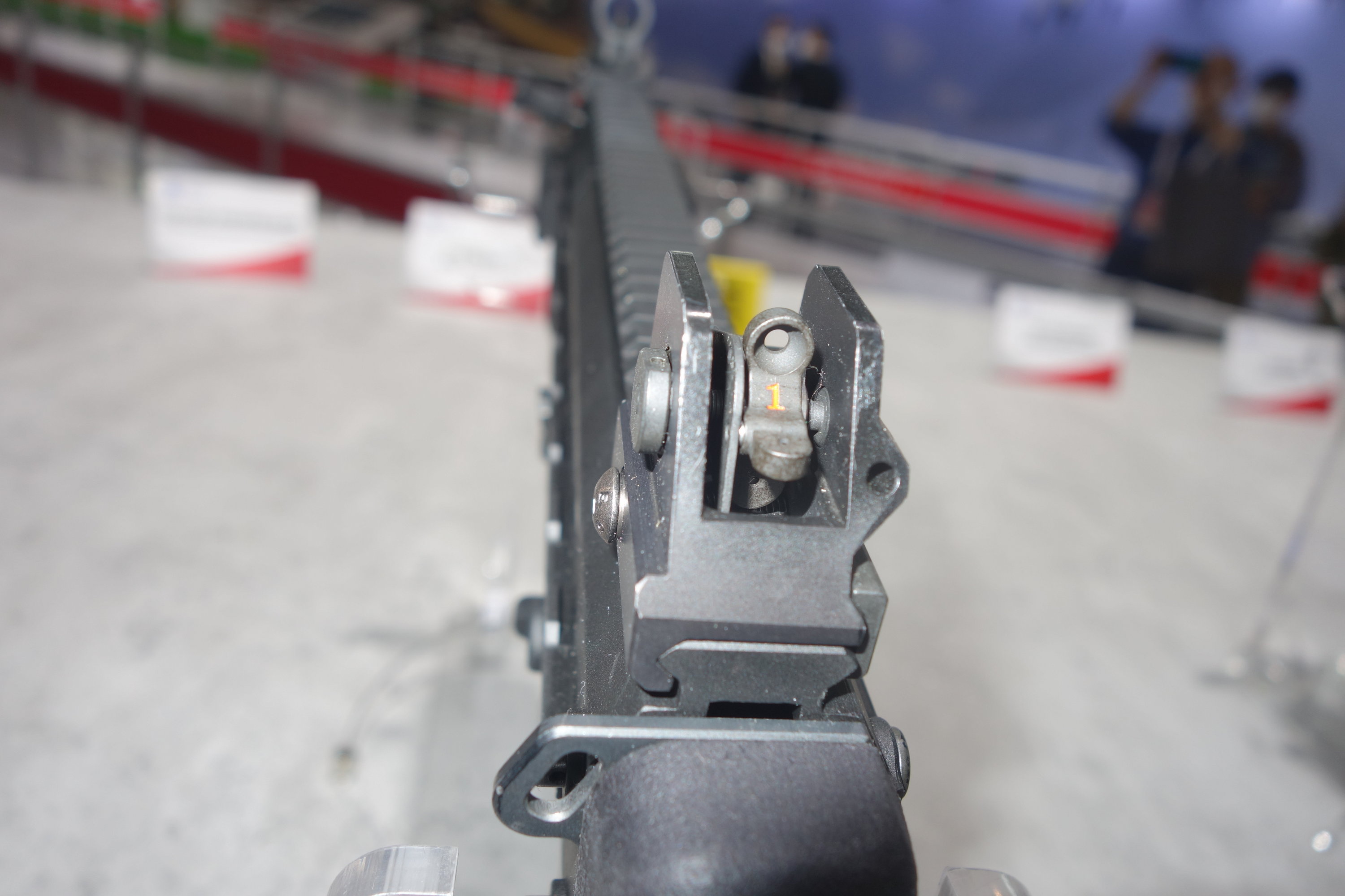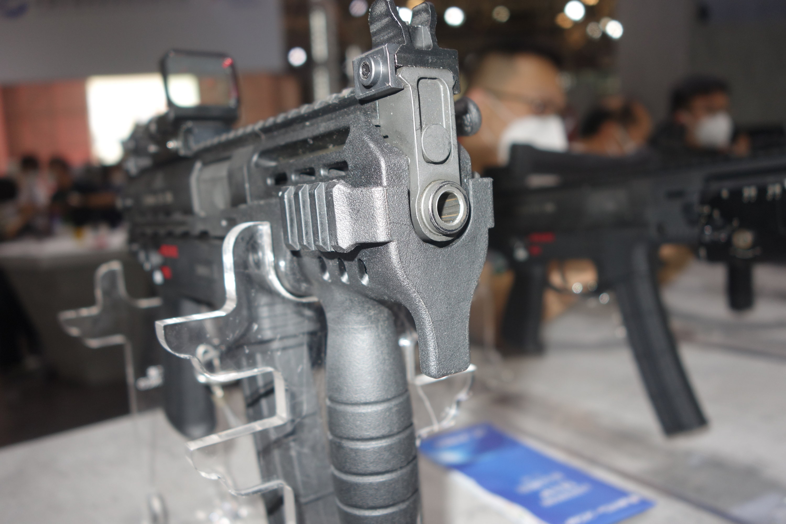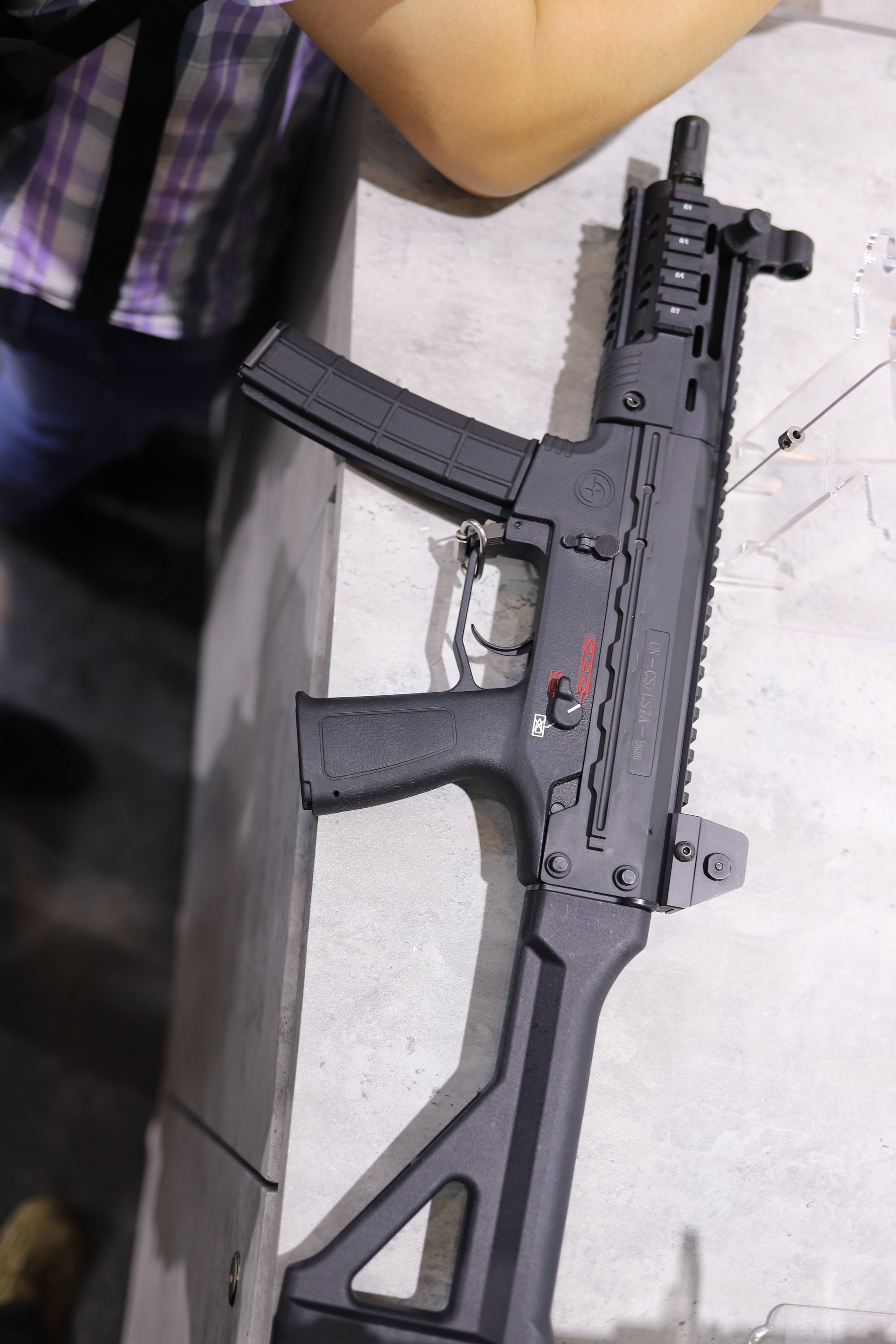 下机匣左侧有空仓挂机释放钮。机械瞄具是固定的,准星有护圈保护。枪托有两种类型,一种是伸缩式,其固定卡扣的设计是类似于MP5的绕轴转动的大拨片;另一种是折叠式的塑料枪托,从图片判断托底板似乎可以伸出。