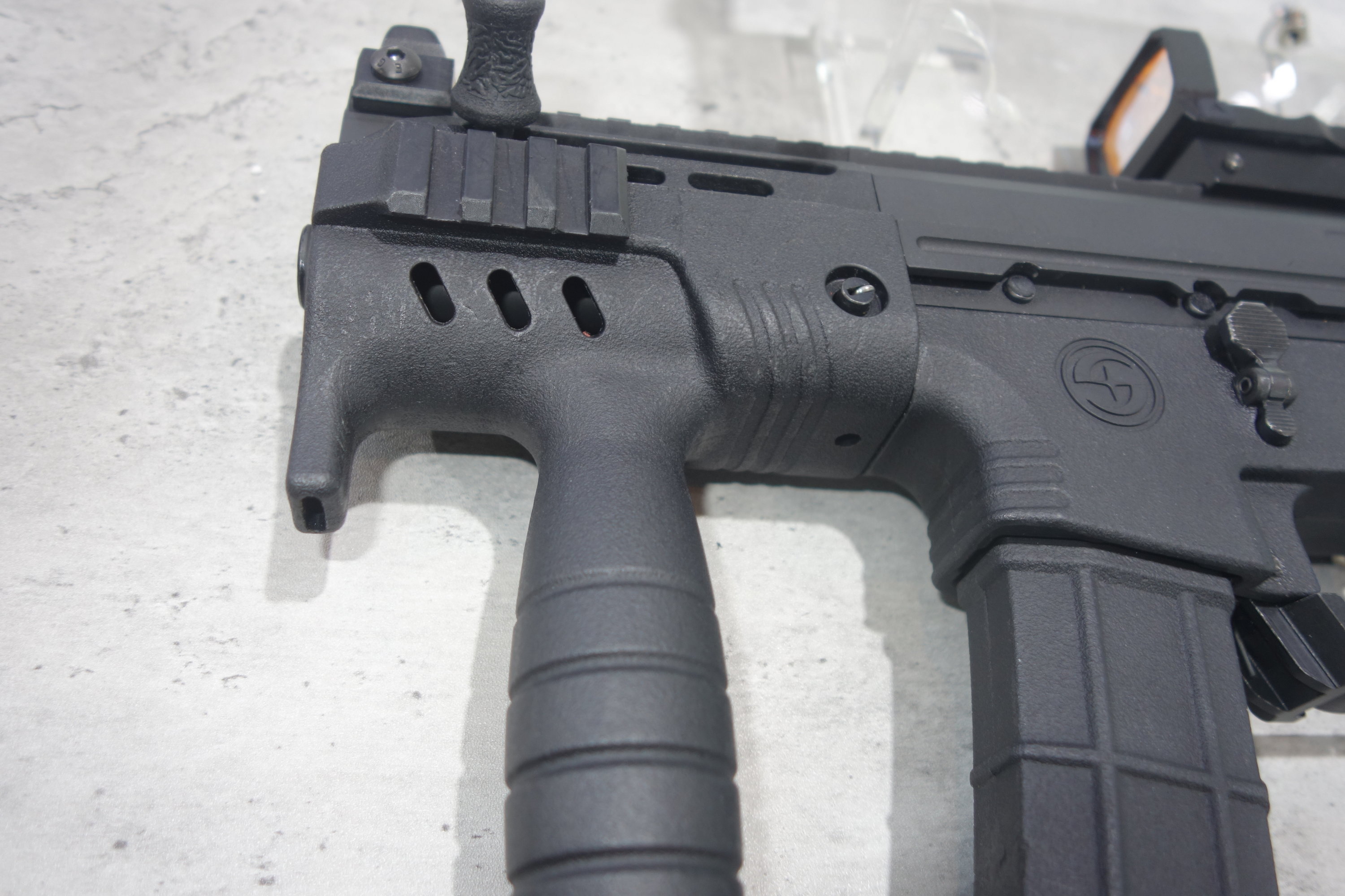 早期曝光的型号中,拉机柄应该可以左右互换,因为在护木上方,两侧位置都有完全相同的拉机柄活动槽。但最近曝光的一种护木上,左侧的拉机柄活动槽被取消。