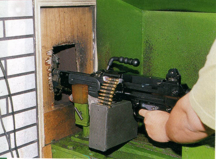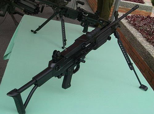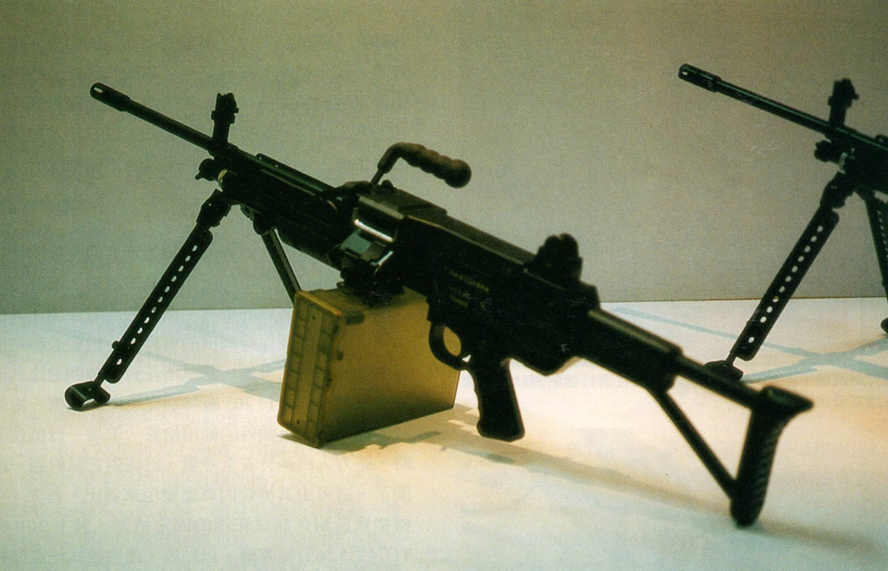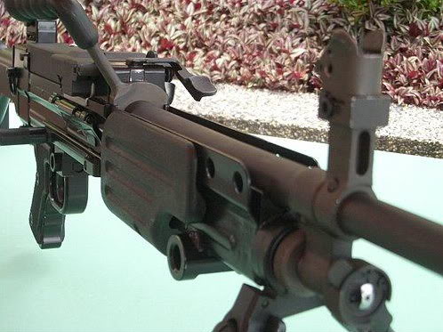 图中的两挺机枪,左边是T75 SFAW,右边是改装了皮卡汀尼导轨护木的FN Minimi(从枪管、准星、活塞调节器等细节上判断)