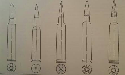 上图为为“第一批”半自动步枪研发生产的性能优异的法国无烟发射药枪弹,这些有别于当时流行的全威力大尺寸弹头的设计有足够好的弹道性能,但对于它们所处的时代过于超前。从左到右分别是: