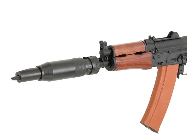 阿富汗战争时期虽然苏军已经全面装备AK74,但其特种部队仍在使用安装了PBS-1消声器的AKM,有时还同时安装了GP25榴弹发射器