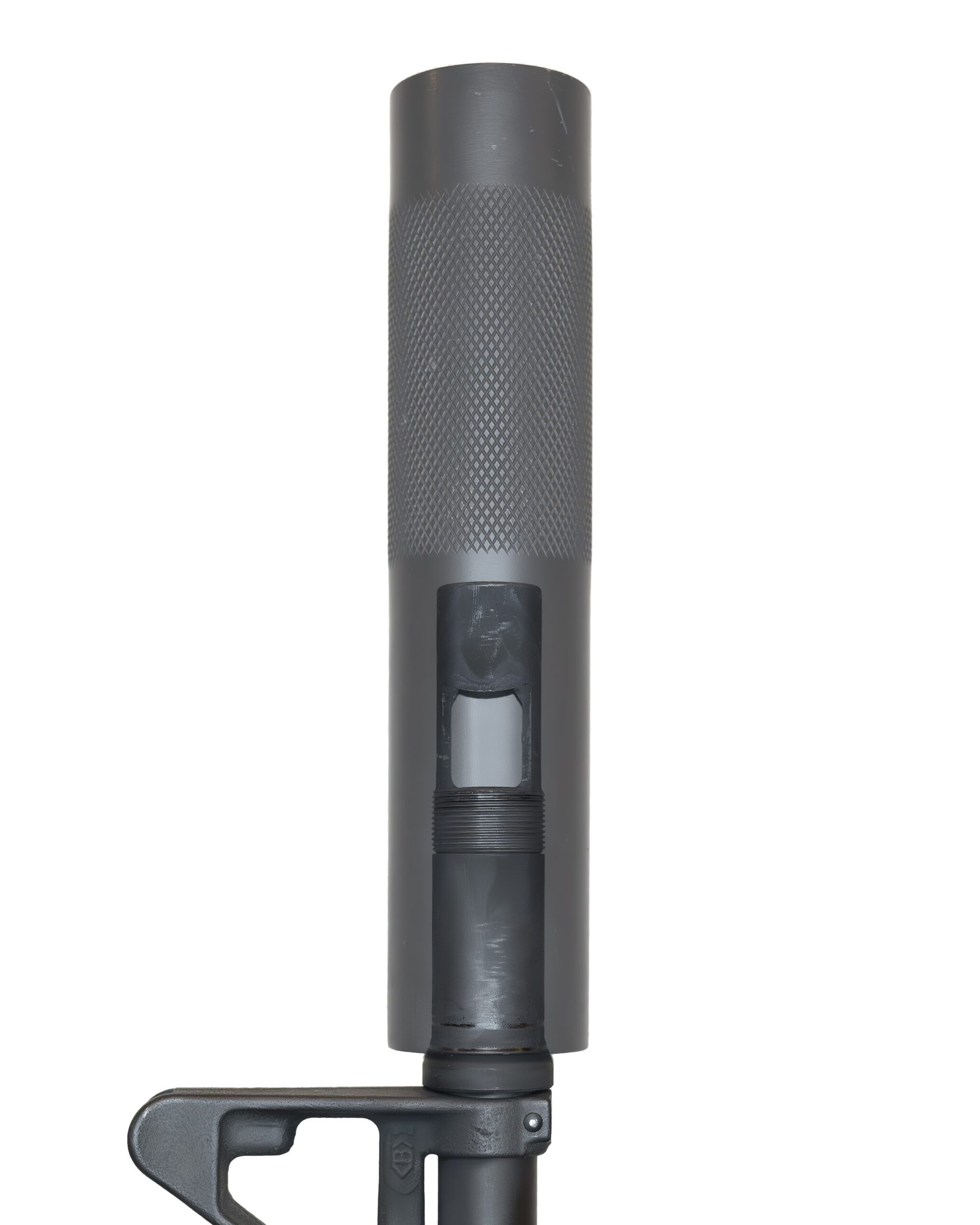 OPS 12th消声器其实上是配MK12 SPR狙击步枪使用的,在不安装消声器时,消焰器外表的螺纹可以旋上一个保护套,消焰器与导气箍之间多出的一个黑色套环前方的锥面就是起第二固定点作用的位置