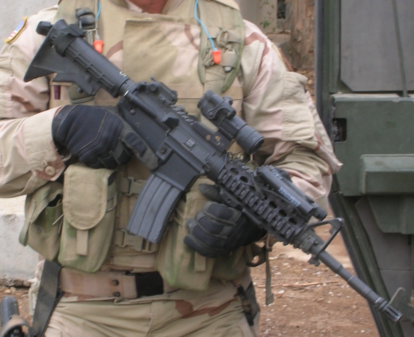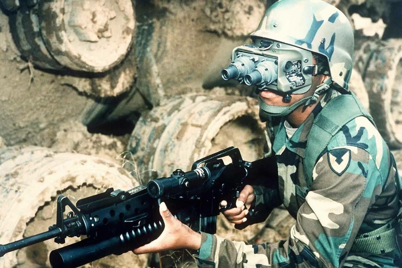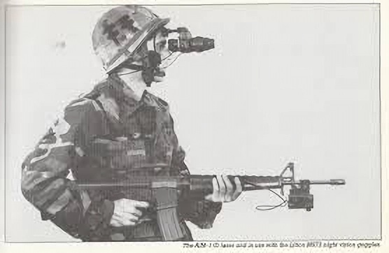 1995年一位美国陆军特种部队(绿色贝雷帽)的M4A1,上面就安装了一个ITT的Night Ranger 4x夜视瞄准镜,而护木右侧则捆绑了一个GCP-2激光指示器