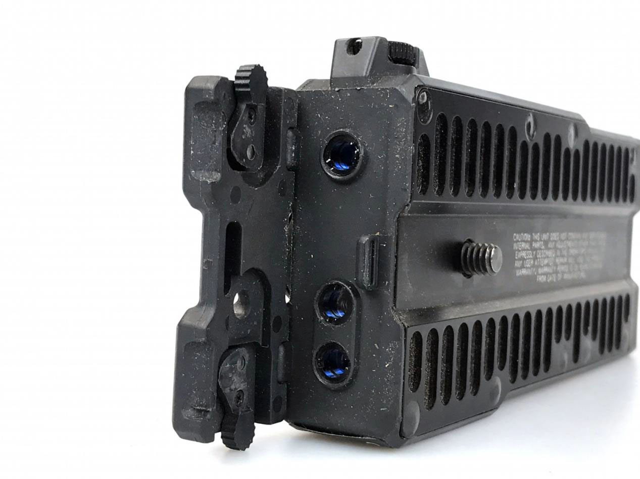 AN/PEQ-7有一个有趣的功能,当射手需要快速切换归零距离时,射手只需要旋转一个带有黄色箭头的大旋钮就可以实现。黄色旋钮周围有两个档位:OTB档和CQB档。OTB代表Over The Beach,该档位的归零距离设置在150米上;而CQB档位的归零距离为7米。旋钮的中心位置是激光瞄准器的风偏调整旋钮。在射手对风偏进行调节时,可以感受到段落感(旋转旋钮有明显咔嗒声)。LCD显示屏的正上方为指示器的总开关。使用者可以在此处为激光器选择低功率输出挡位或高功率输出挡位。AN/PEQ-7由单节CR123 3V一次性电池供电。
