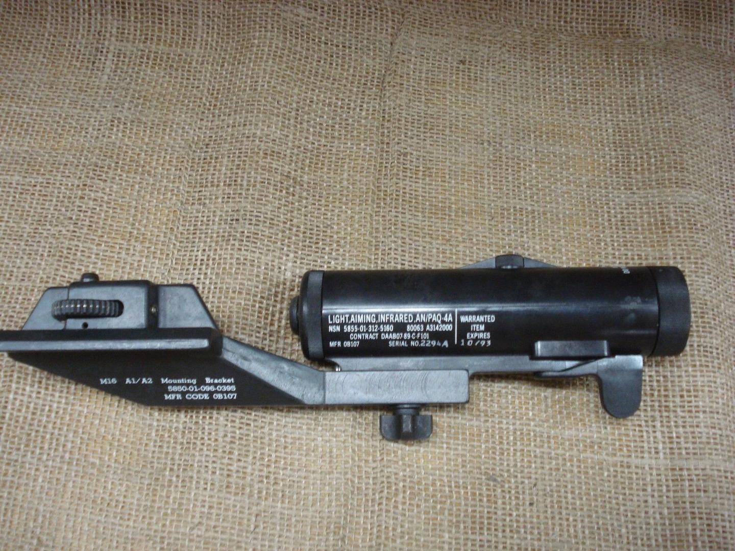 AN/PAQ-4是在1980年左右开始服役的激光指示器,它的外形看起来好像一个战术手电,但实际上发射的是肉眼不可见的红外激光,主要是在夜战中配合头戴式夜视装置使用,比如在1972年左右开始正式采用的AN/PVS-5。当时还没有发明皮卡汀尼导轨,AN/PAQ-4是先安装在一个专门的固定底座上,而这个底座则通过M16提把上的瞄准镜安装孔来固定。安装后这个红外激光指示器是位于护木的左上方。下图可以清楚展示它的安装方式。