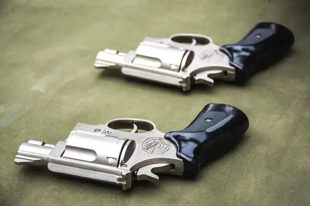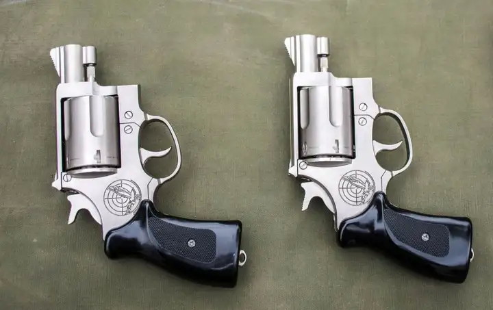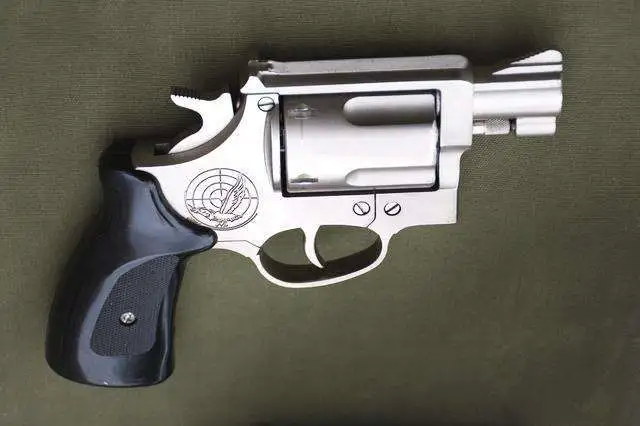 2010式10mm转轮防暴手枪同样是采用纯双动击发机构,发射10mm布袋弹和10mm催泪弹两种弹药。该枪设计有专门的自动击锤保险,部分型号还有手动保险,但与韩国原型在外形上有差异。准星、击锤等也与设计原型在细节上有不同的设计,准星是三角形,但有光滑和加工有纹路(防止反光)两种样式,均有切角。击锤做了切尖处理,加工有防滑纹路。