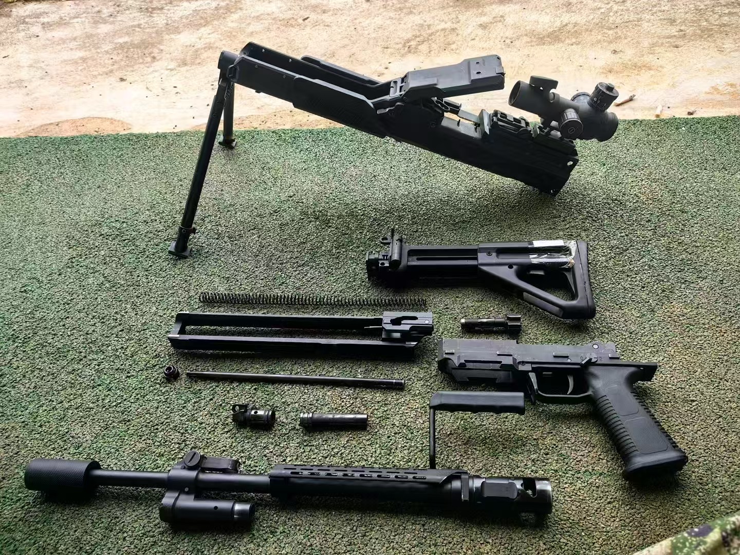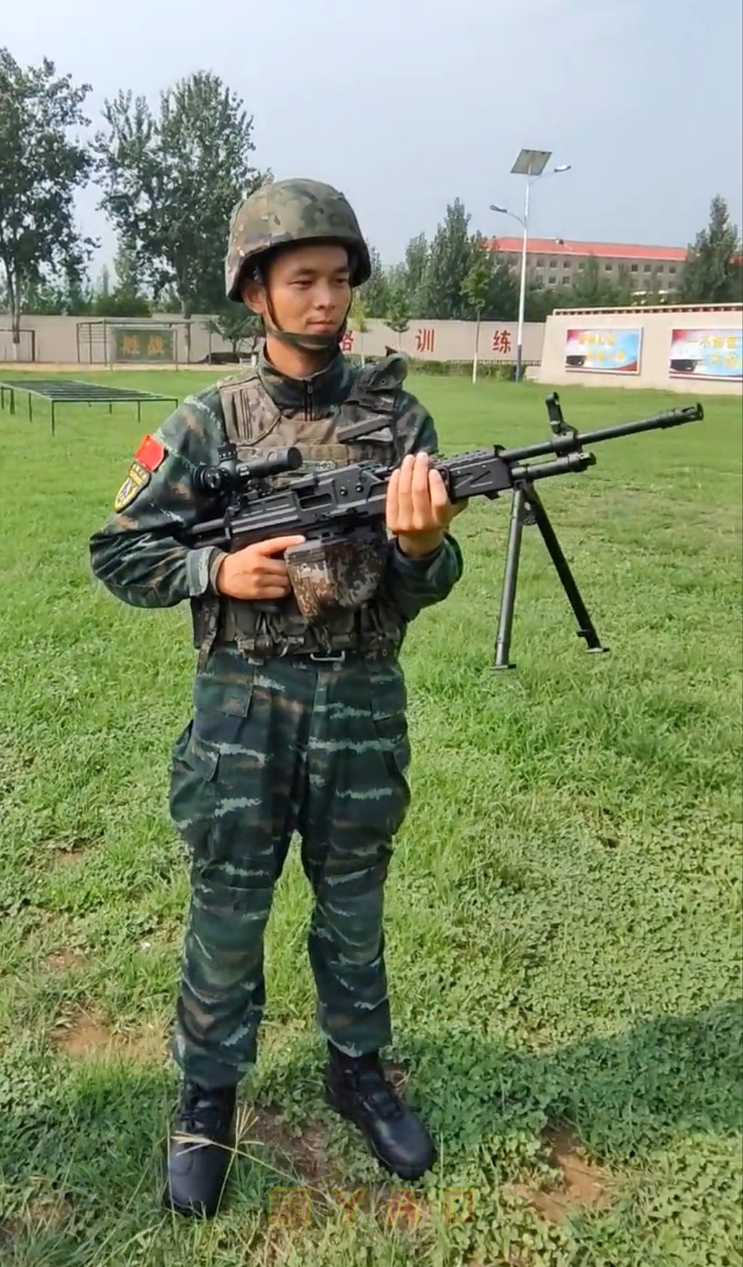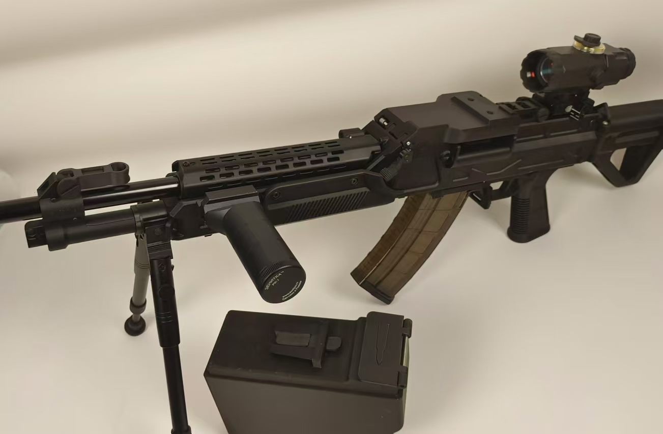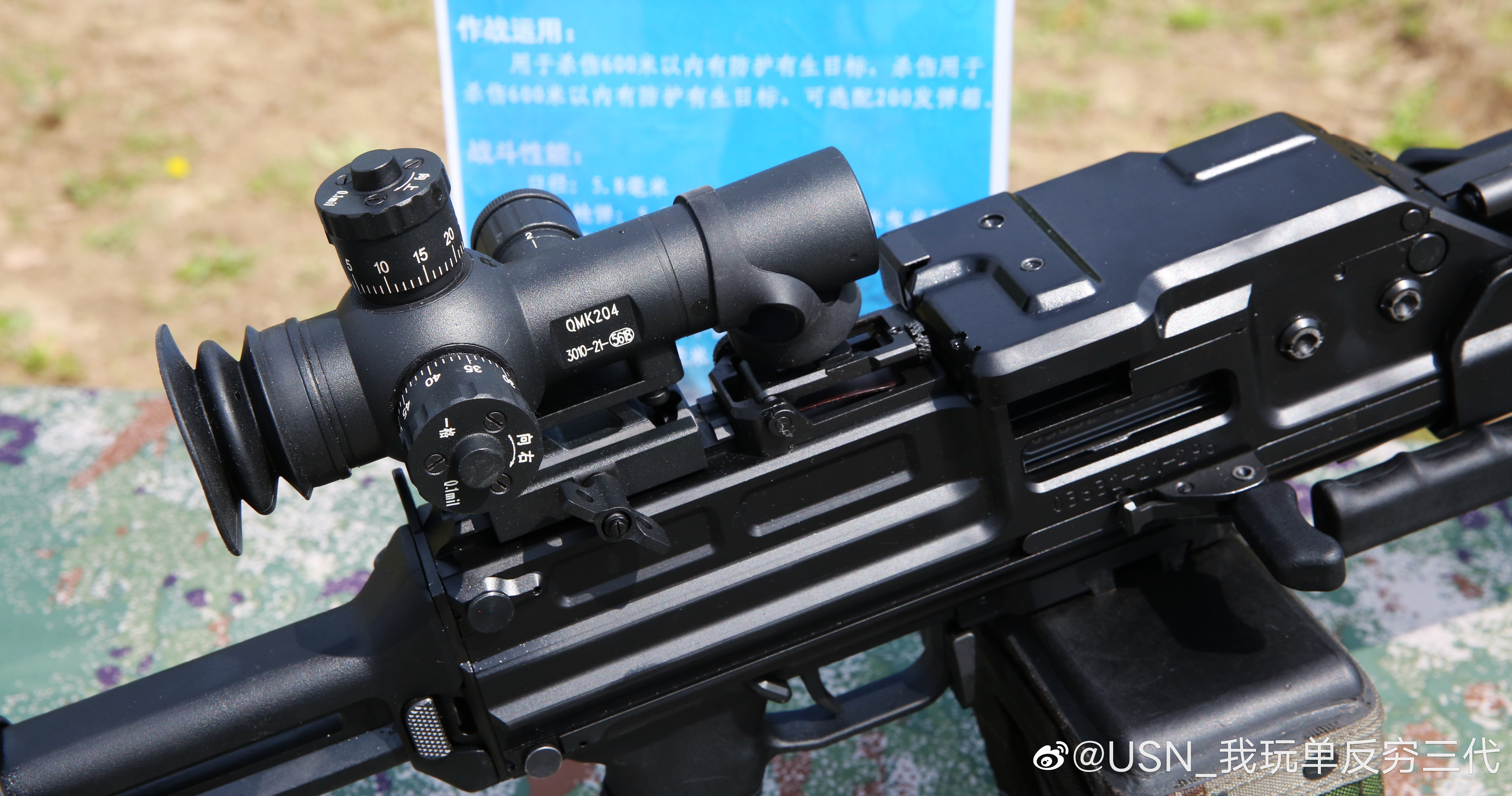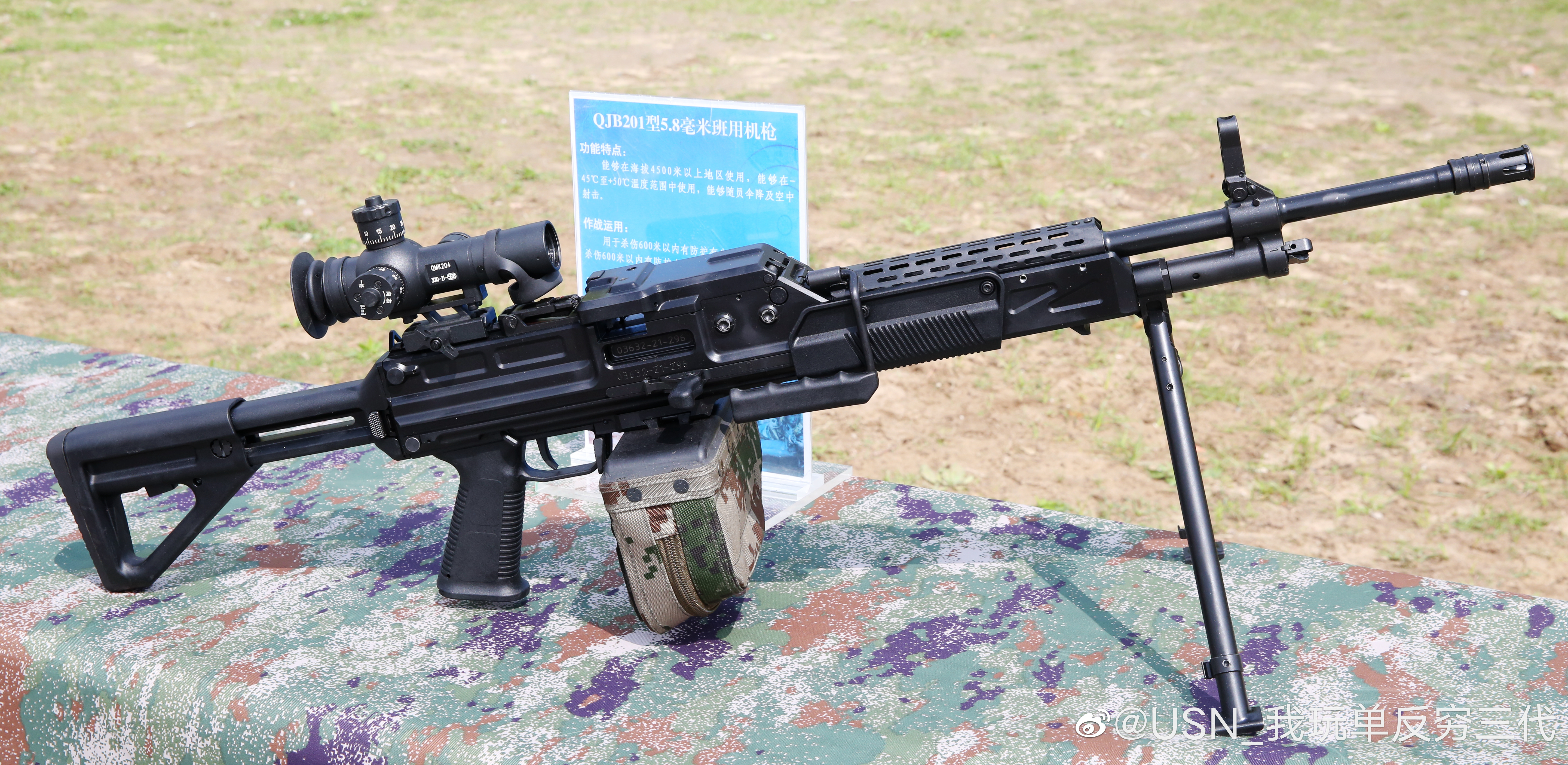 QJB201式轻机枪于2016年开始研发,2020年设计定型。该枪最早被曝光的是上面这张照片,因而被网民们戏称为“菜地机枪”,但其实它有另一个称呼是“伞兵机枪”。其后几年偶有公开露面,被人发现机匣上的铭文是QJS-161,不过最终被定型为QJB201。