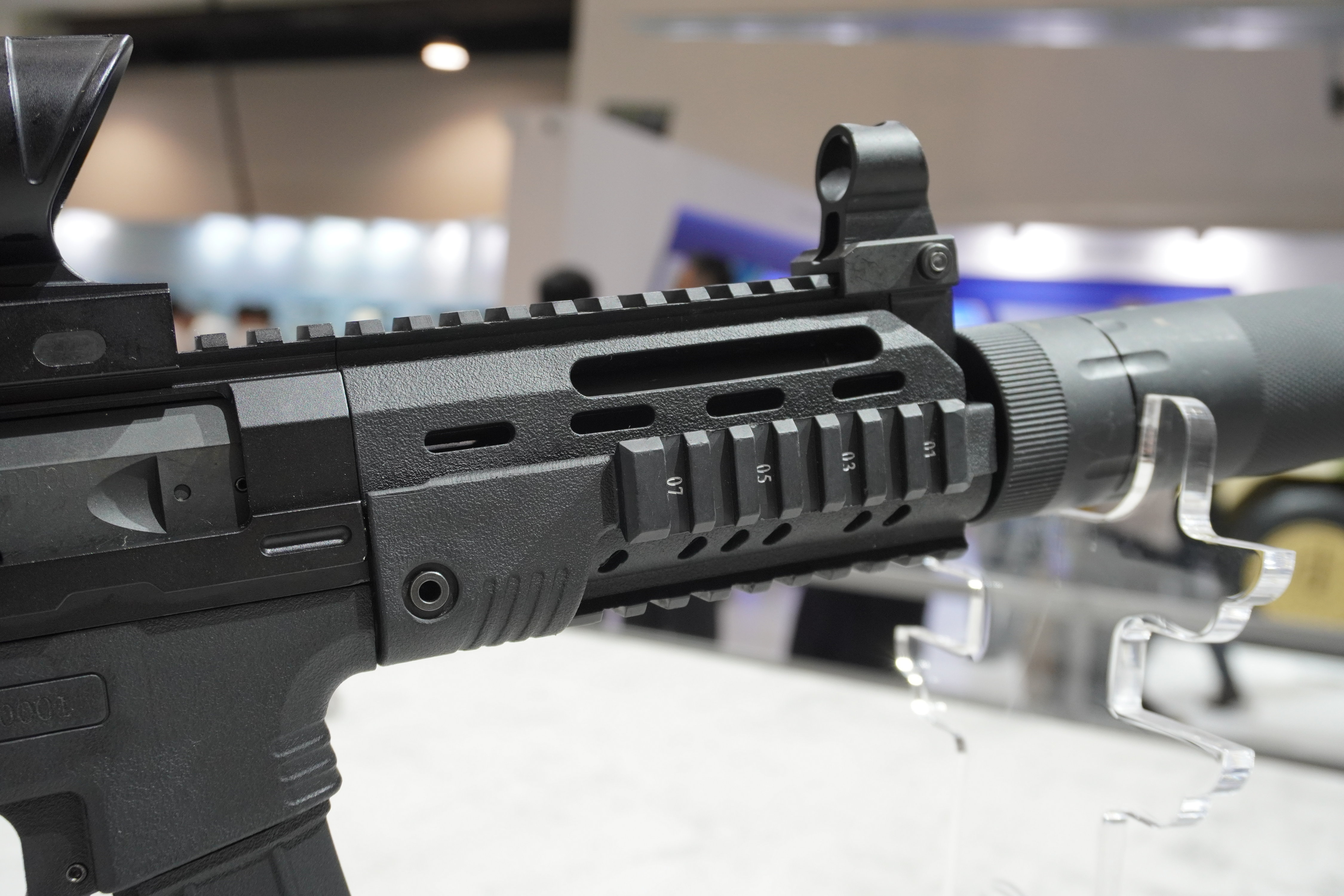 较早时曝光的CS/LS7,顶部的全长式导轨延伸至准星座,护木的3、6、9点位置也有固定导轨,护木上的导轨是整体注塑出来的,并不是加上去的
