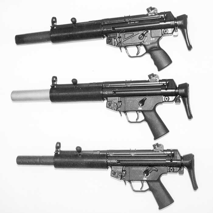 安装不同消声器后的MP5SD,从上至下:HK原厂、Qual-A-Tec公司、KAC公司