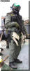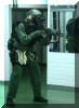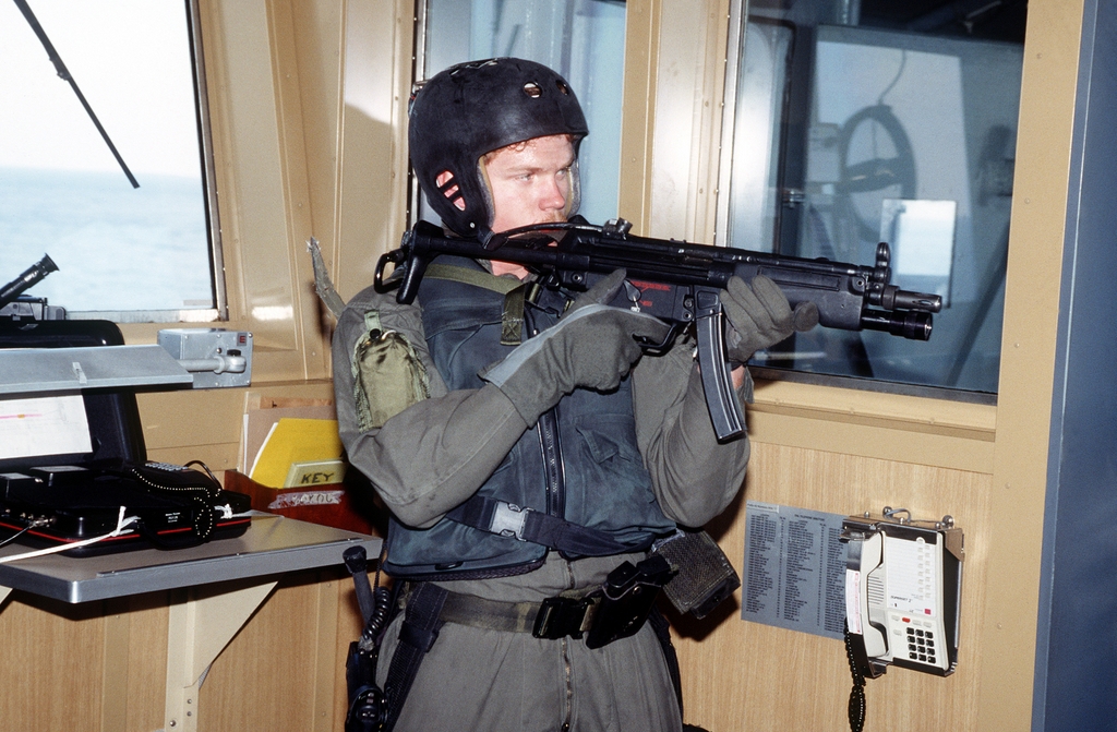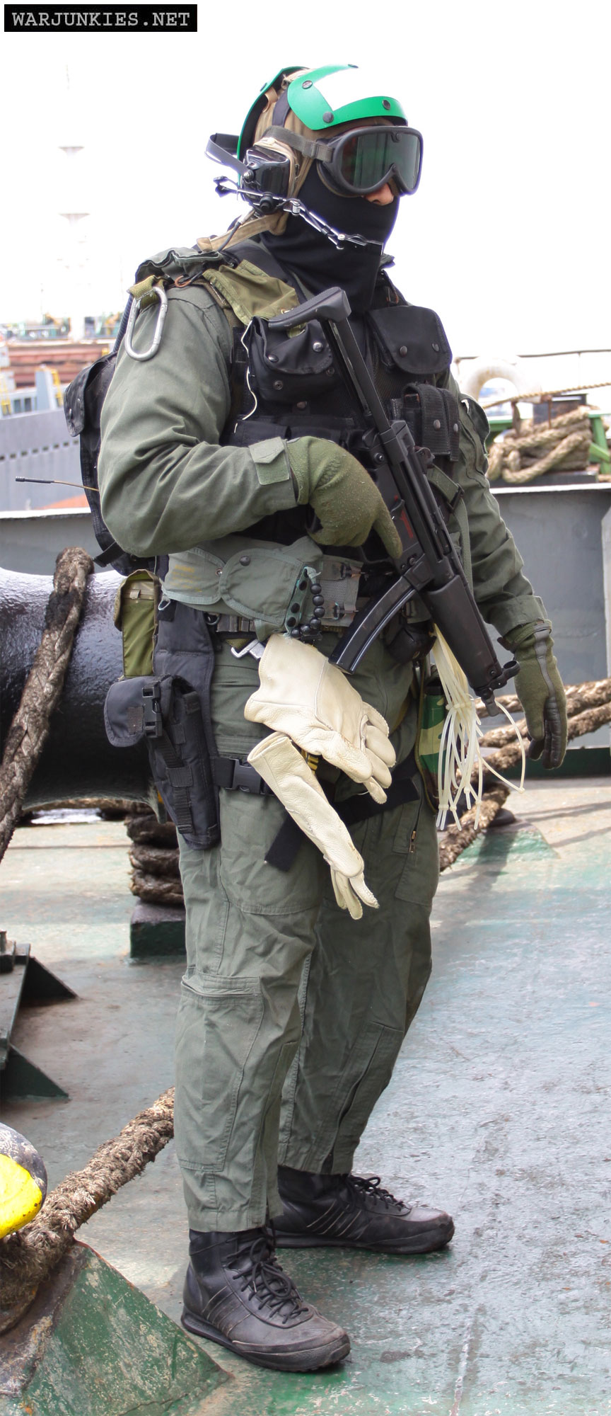 身穿27P作战服、头戴树脂盔的海豹成员正在登船,MP5-N的枪口上装有消焰器,枪口下是SURE-FIRE战术灯