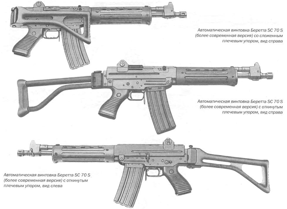 伯莱塔AR-70/90步枪是在保留AR-70/223步枪基本结构的基础上,作了某些改进。全枪105个零部件中有80%可以互换。与70/223系列一样,除基本型外,70/90系列步枪也有卡宾型、特种卡宾型枪和轻机枪型等型号。基本型AR-70/90突击步枪采用固定塑料枪托,主要装备常规步兵;SC-70/90卡宾枪采用折叠金属枪托,主要装备特种部队;SCP-70/90短卡宾枪采用短枪管和折叠金属枪托,主要装备装甲部队、特种部队和空降部队;此外还有一种SCS-70/90短卡宾枪,与SCP-70/90短卡宾枪的区别在于没有导气调节装置。AS-70/90轻机枪的枪管比AR-70/90步枪的枪管重,不能快速更换,配有金属护木、两脚架和专门枪托。70/90系列步枪在意大利军队的装备数量共约15万支,在1993年前装备了5万支,其余在1994年后陆续交付。