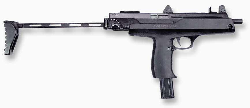 该枪采用T形布局,手枪握把、前握把和扳机护圈是一个整体式的塑料件,机匣尾部连接着折叠轻型枪托,枪托为钢制,安装有塑料托底板,在不使用时可向右折叠。拉机柄安装在机匣顶部,但有一个U形缺口而不会阻挡机械瞄准具。机匣尾部快慢机旋柄,可选择单发或连发。30发盒形弹匣插入手枪握把内。该枪既可发射俄罗斯国产的7N21弹,也可发射其他国内外生产的9×19毫米枪弹。翻转式缺口照门可表尺为100米或200米。