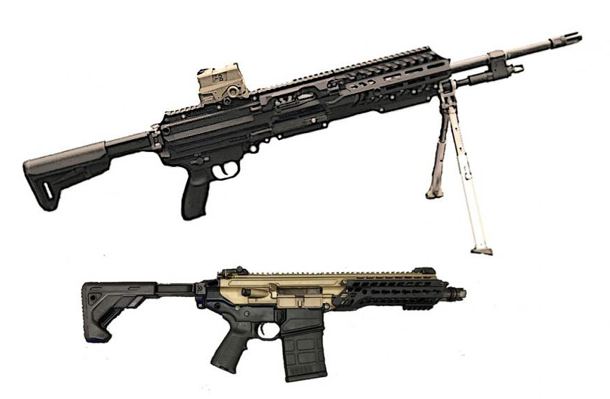 美国SIG在2021年SHOT Show上展出的NGSW原型枪:上面是新MCX-SPEAR,已经改成M-LOK护木