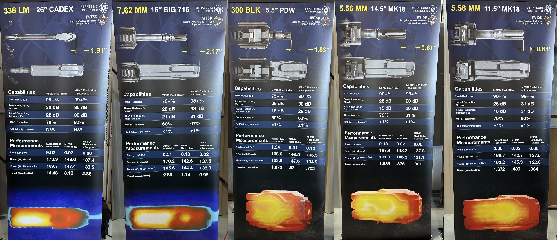 ![]() 从2023年开始几乎每年SHOT Show上的MFMD摊位都会挂这几张海报,上面显示了至少4种信息:1是安装MFMD后枪口长度不会增加太多;2是这些基础型消声效果比传统消声器要稍低;3是后坐力可以减少一半以上;4是每种枪型可能都需要配专门的MFMD型号,通用性比传统流消声器要差一些,这是因为OTB结构受护木至枪口距离的限制 |