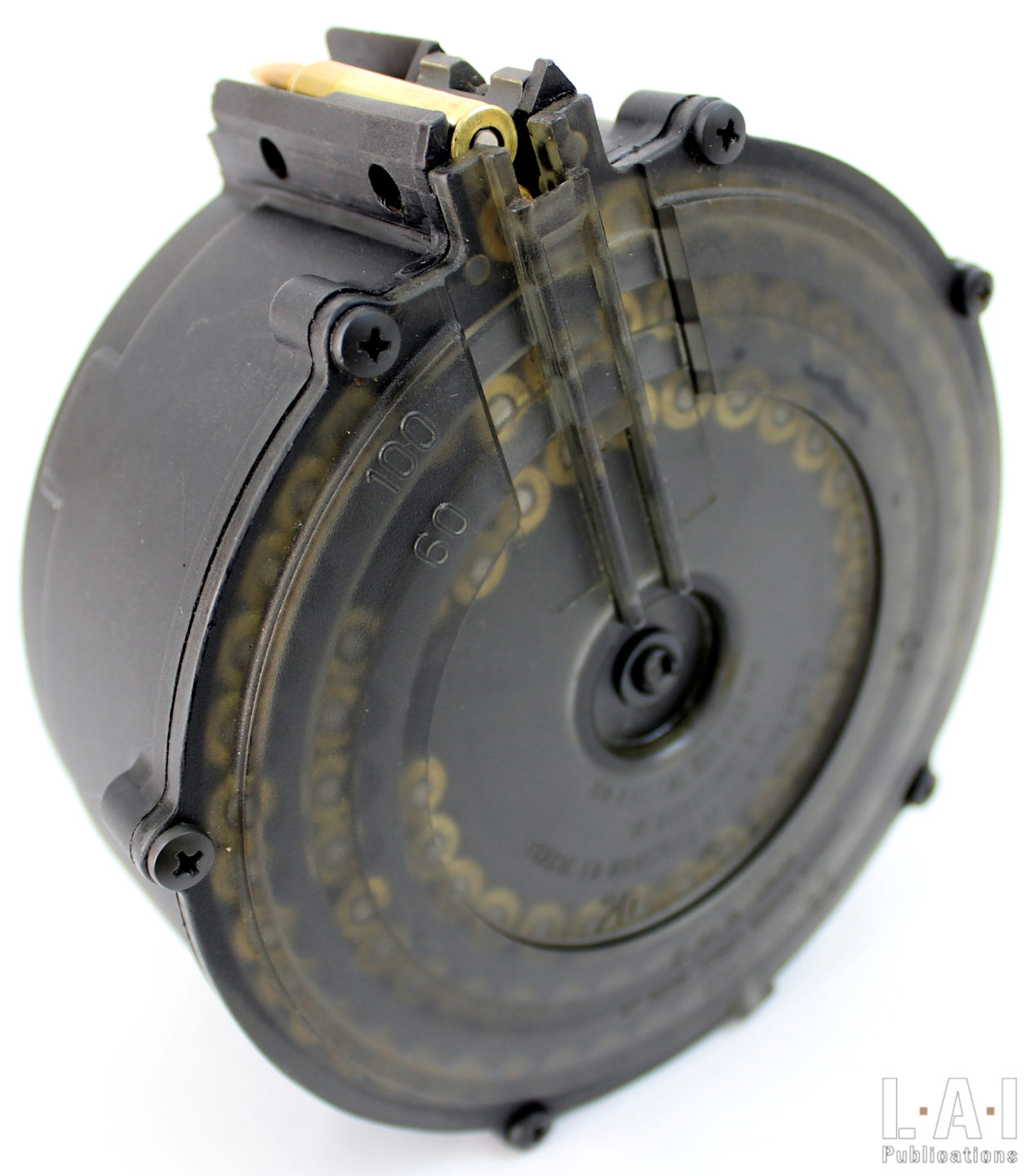 由于Ultimax 100的弹匣卡扣形式与M16的弹匣座不相同,因此为参与美国海军陆战队竞标项目而改进的MK4型采用了一个新的弹匣插座,以便能使用100Beta C-Mag弹鼓或M16弹匣。有意思的是,C-Mag弹鼓最初也是由詹姆斯·沙利文研制的,在早期的设计中,其双鼓形弹匣体是采用尼龙材料,而中间的盒形部分由钢制成。因为枪弹在弹鼓内运动时摩擦力较盒形弹匣的大,采用尼龙鼓体可以降低摩擦力,不需要加上石墨粉之类的润滑物就能以保证枪弹在弹鼓内运动顺畅。后来Beta公司把尼龙双鼓部分换成另一种塑料聚合物,并把中间的盒形部分也改为聚合物,同样不需要润滑,而且能降低成本和减轻重量,但需要加强盒形部分来防止在射击时开裂。Beta公司最近还为C-Mag弹鼓的背板改为黑色半透明的塑料(Lexan莱克桑),就像原本的乌蒂马斯弹鼓的半透明背板一样,方便射手在战斗期间掌握补给弹药的时机。
