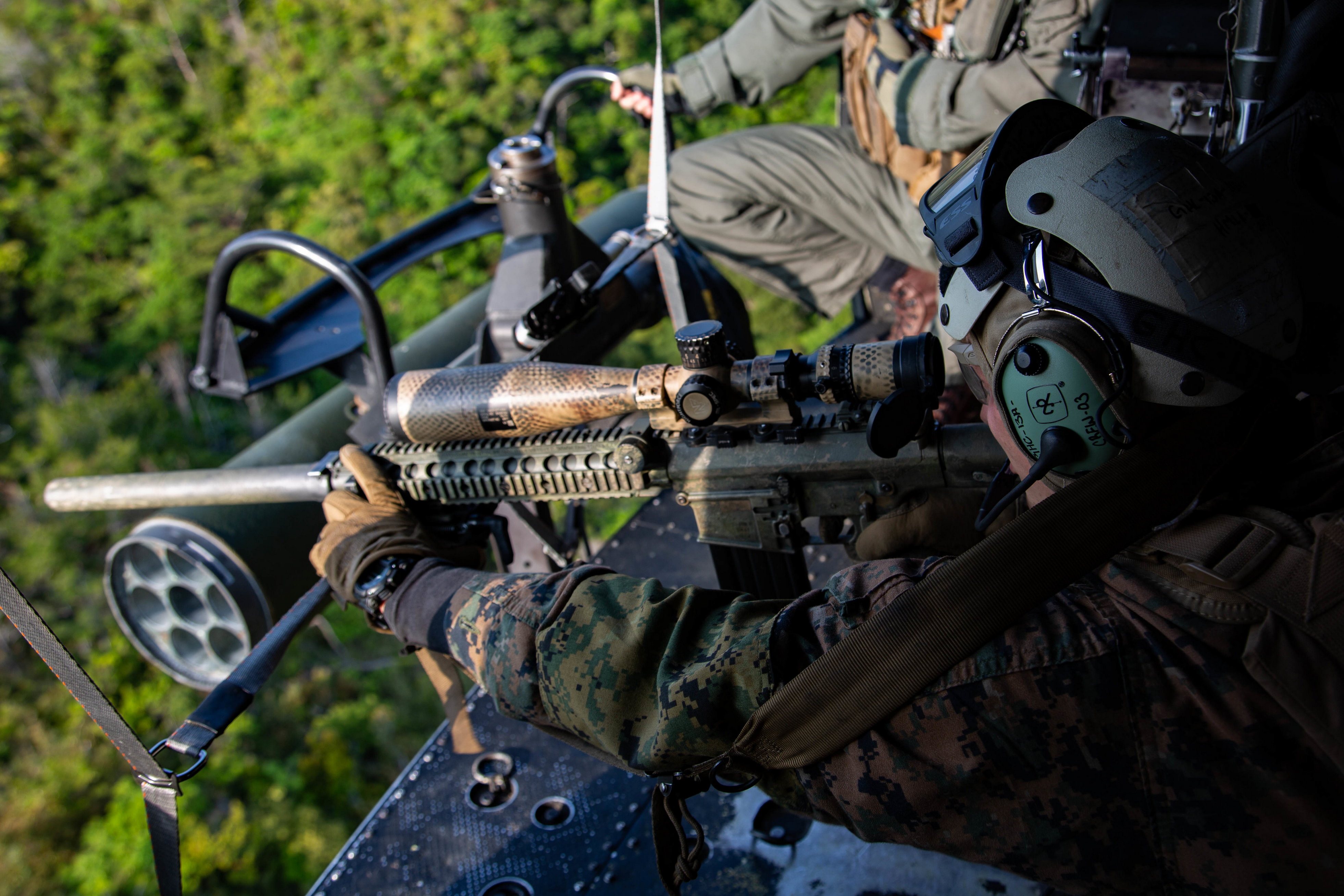 三角洲突击队的狙击手在直升机上使用的M110,安装低倍率宽视场的瞄准镜,并配上垂直前握把,显然不是用作远距离狙击武器的