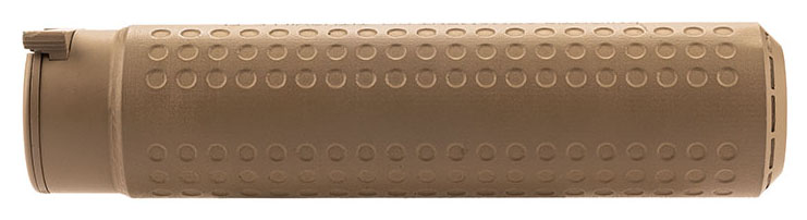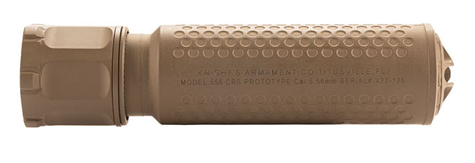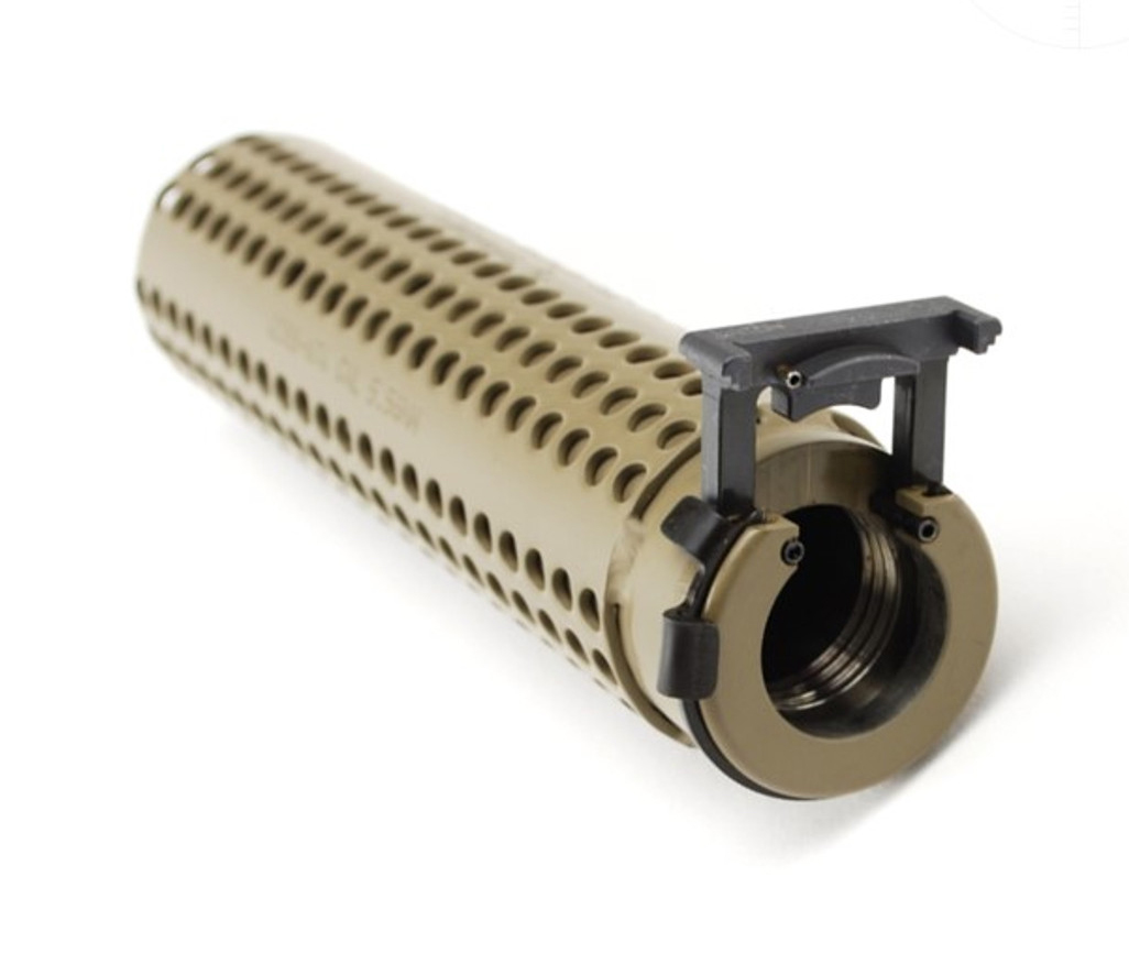CRS-2:这是KAC快拆消声器的第二代,CRS就是“战斗步枪消声器”(Combat Rifle Suppressor)的缩写,比起第一代的NT-4消声器,CRS-2消声器的长度略短,性能相当,但采用了新的QDC快拆系统,QDC系统采用轴向卡口+旋转锁合的接口方式,消声器与消焰器通过3~4个对称凸耳啮合,旋转约30°~45°即可完全锁死,且自带机械定位与锁定反馈,比起第一代的QDSS系统,不但装拆更便捷,安装后的同轴度也更高。