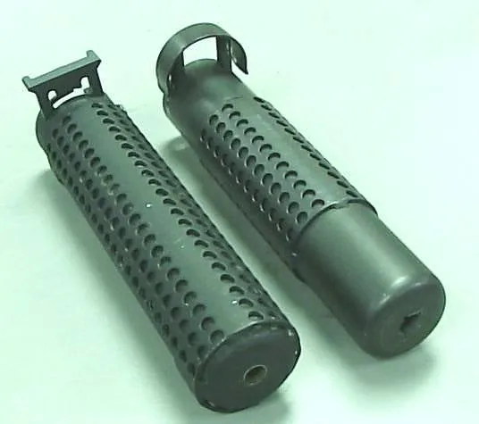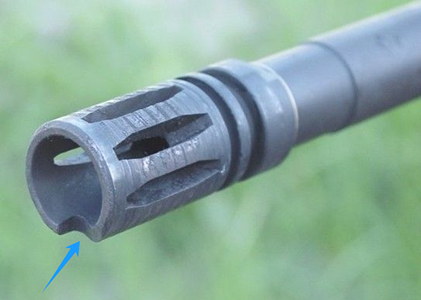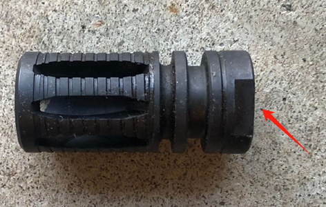 NT4消声器配套的QD消焰器,绿色箭头处为插入消声器时的导引斜面,红色箭头是配合锁紧门闩形突笋的紧锁凹槽