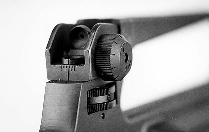 M16A2步枪的表尺上设置了两个觇孔,大觇孔直径5mm,主要用于200米以内近距离或对运动目标的瞄准;小觇孔直径1.78mm,主要用于精确瞄准或对远距离目标实施瞄准。此外表尺上还设有一个横风修正螺帽,用手指就可迅速调整表尺距离及风偏量。