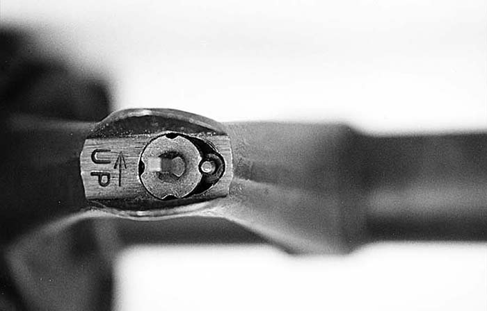 M16A1的觇孔,大觇孔用于0-300米内的近距离目标、运动目标及夜间条件下的射击,小觇孔用于300-460米距离目标的精确射击,翻起小觇孔时会看到“L”字的标记。