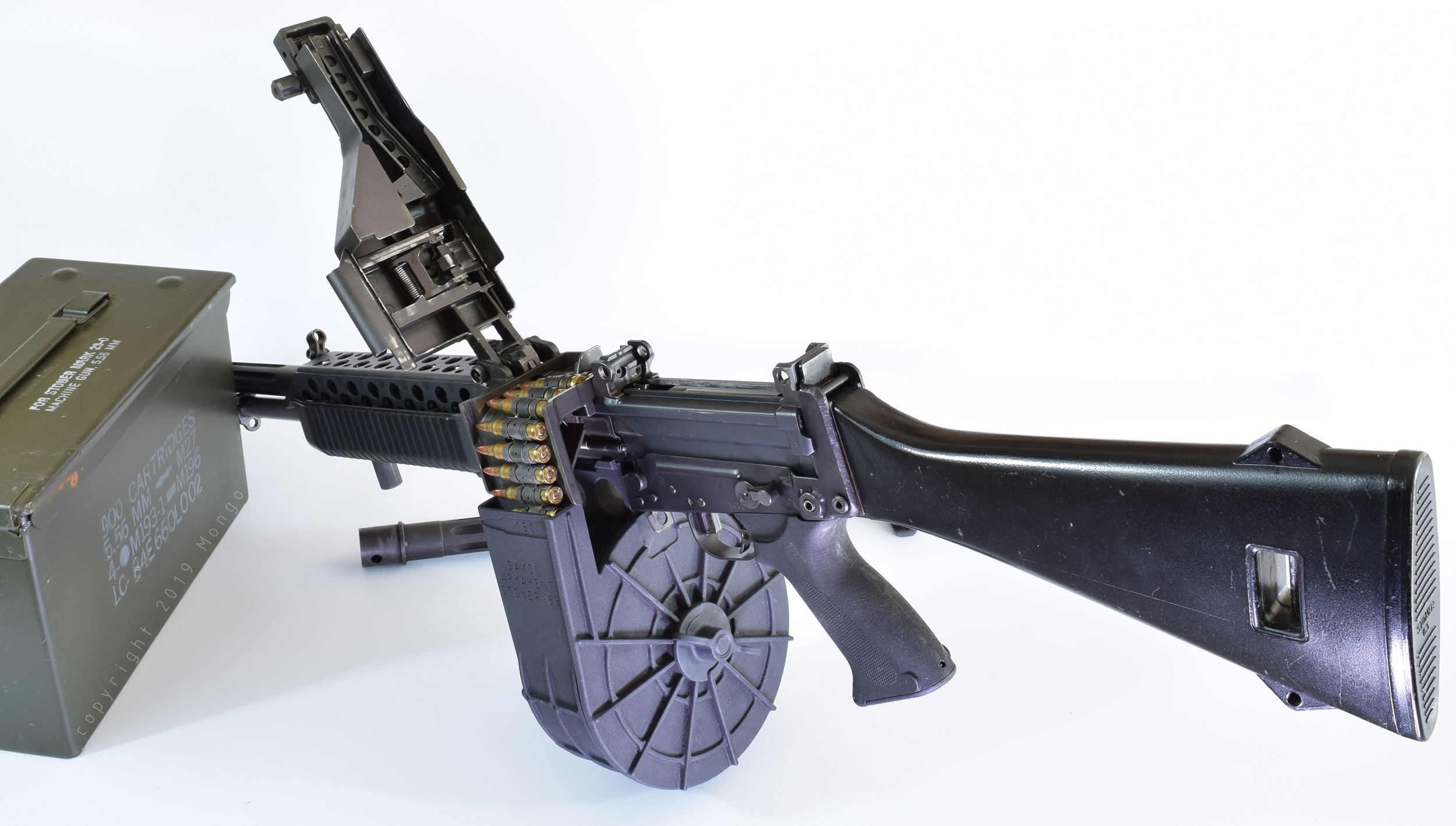 随枪挂载的供弹箱有100发方形弹箱和150发鼓形弹箱两种,这两种弹箱都有护盖保护从弹箱进入受弹机这段距离内的弹链,这样的设计是考虑到在丛林里活动时外露的弹链容易被勾挂。和轻机枪型一样,“突击队员”型也是分别有左侧或右侧供弹的早期型和后期型,鼓形弹箱只有左侧供弹的型号,而方形弹箱则左、右两种都有。